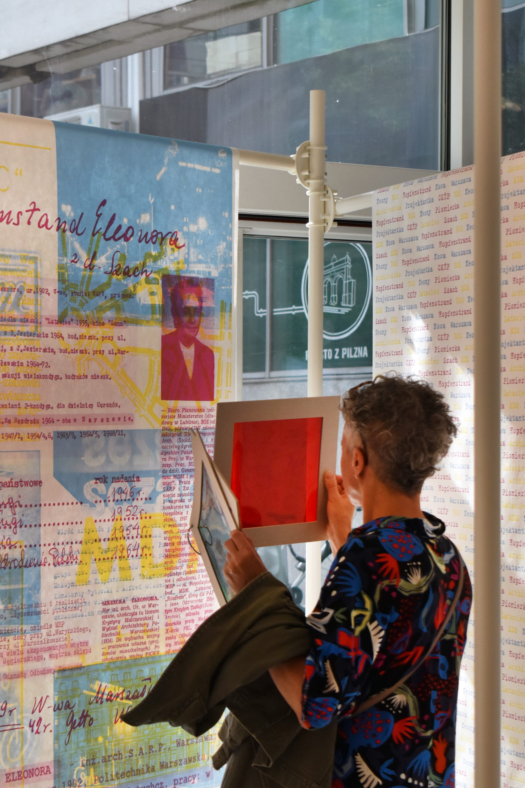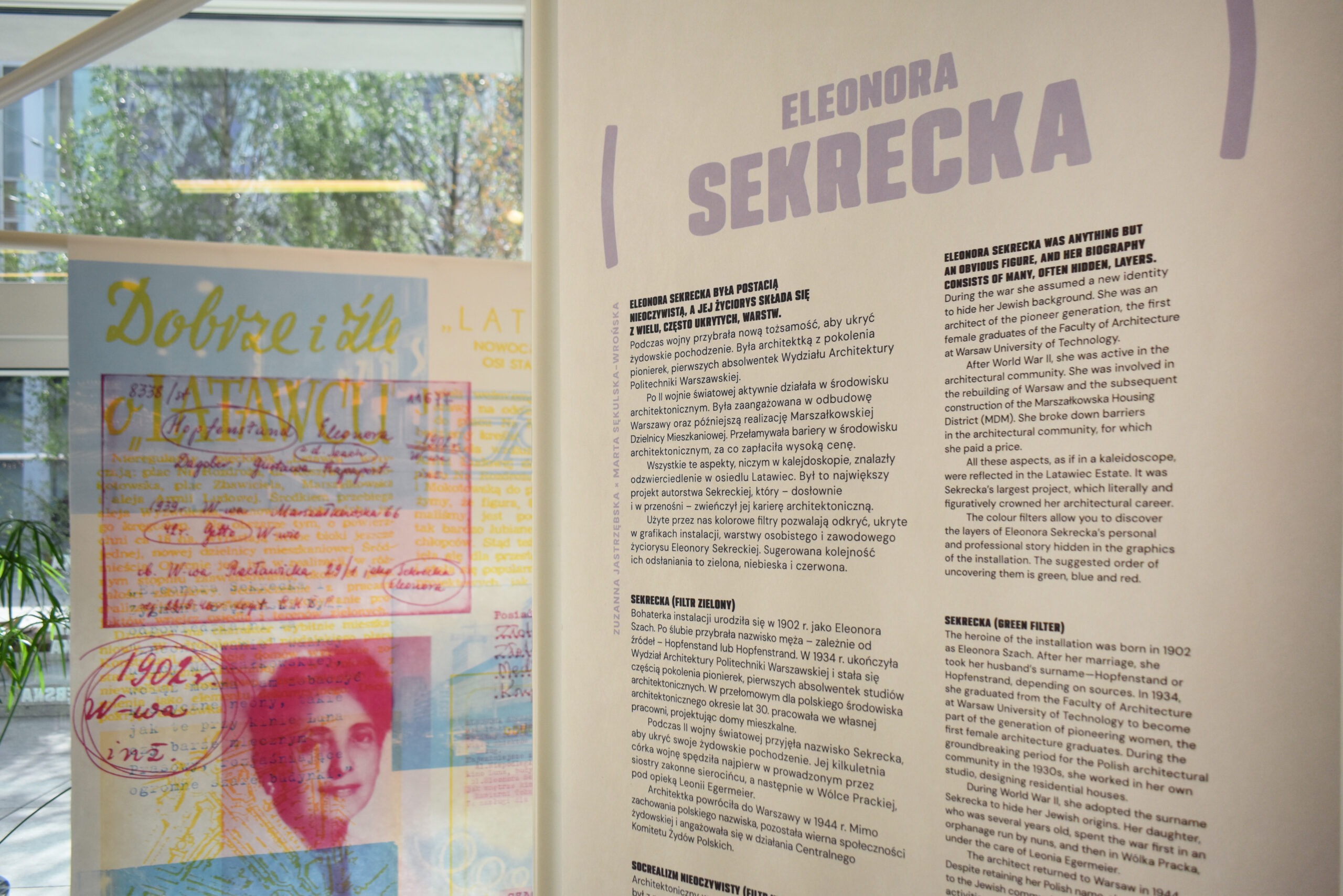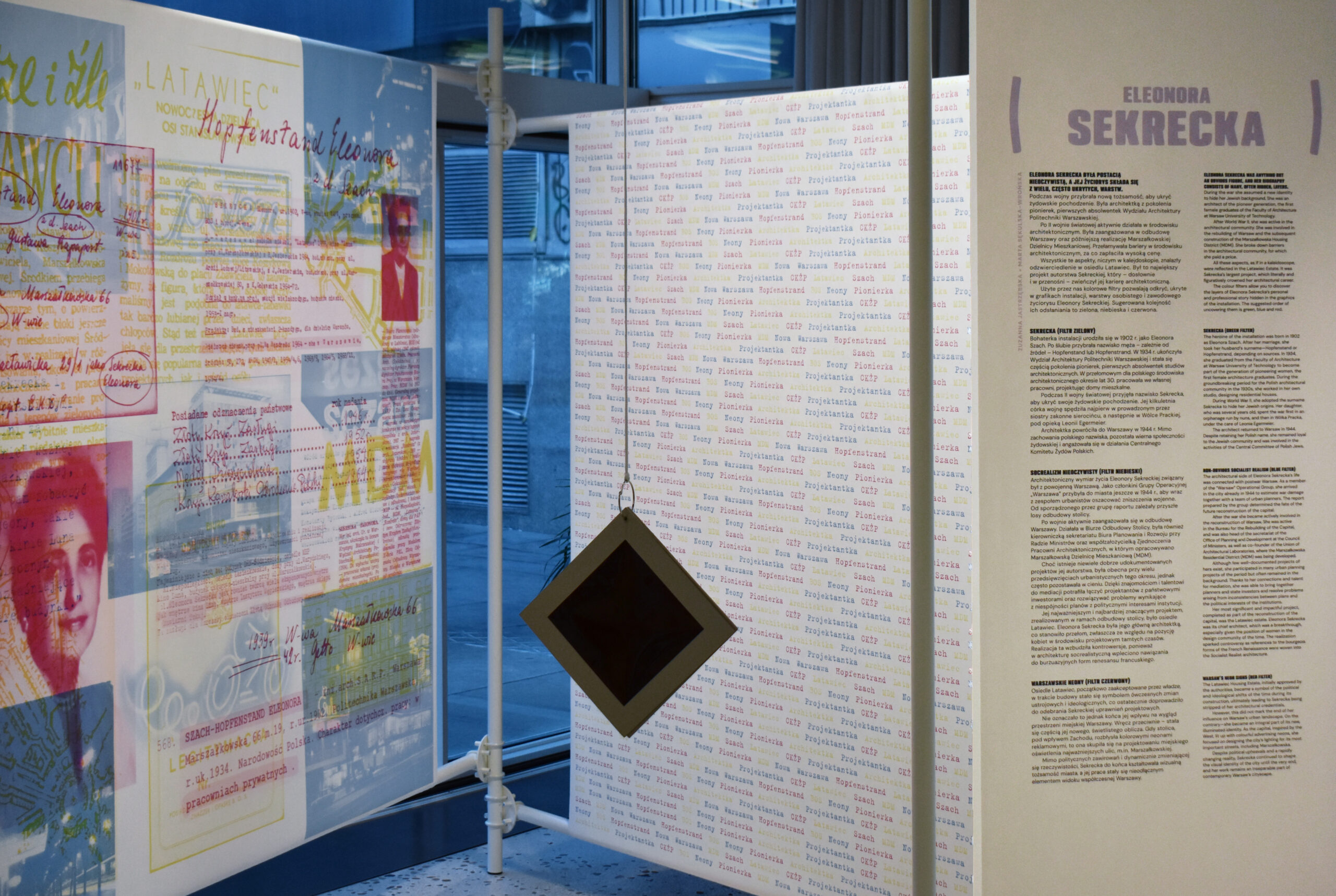 The colour filters allow you to discover the layers of Eleonora Sekrecka’s personal and professional story hidden in the graphics of the installation.