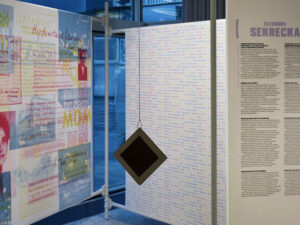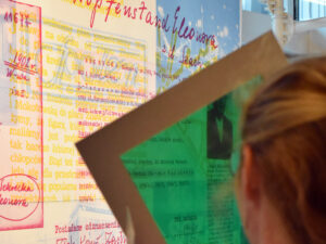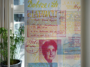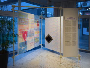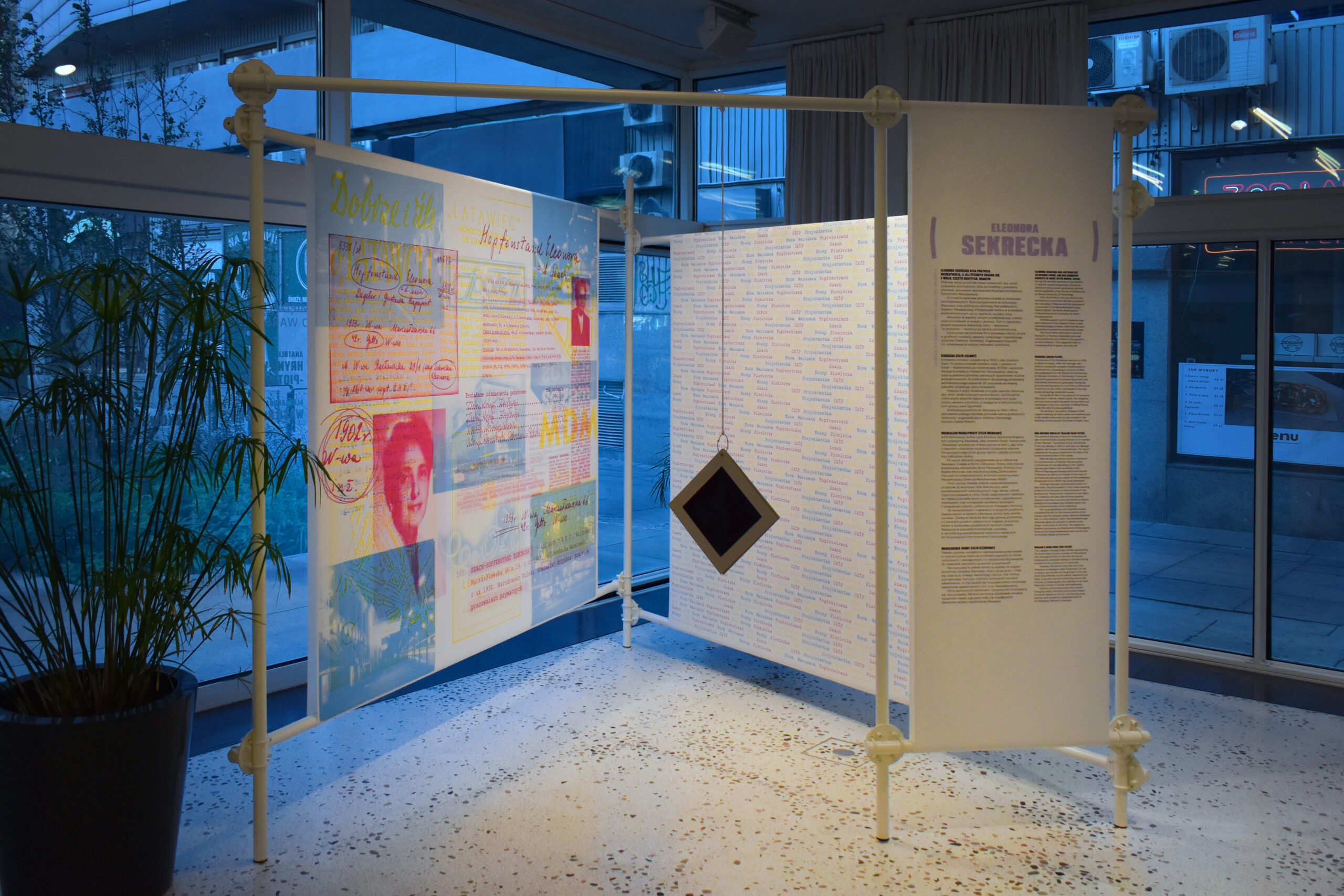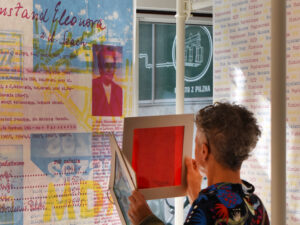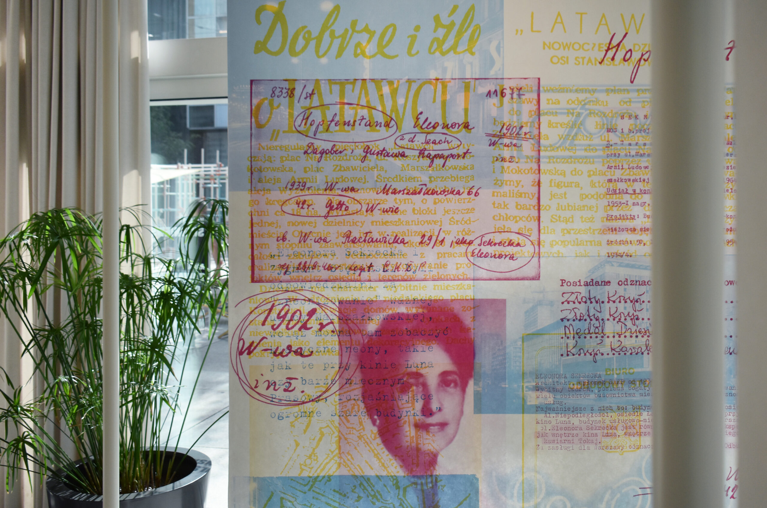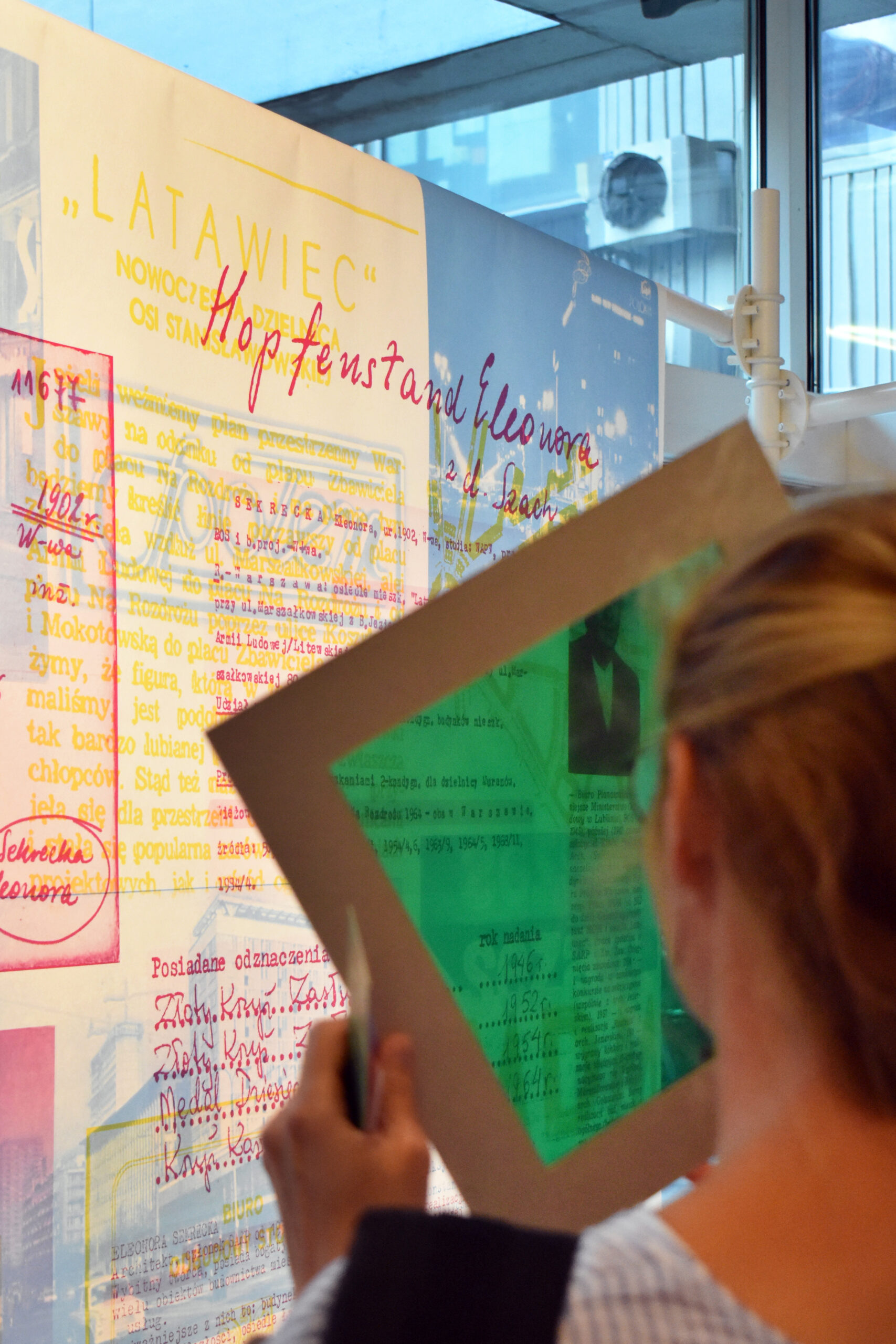 The colour filters allow you to discover the layers of Eleonora Sekrecka’s personal and professional story hidden in the graphics of the installation.